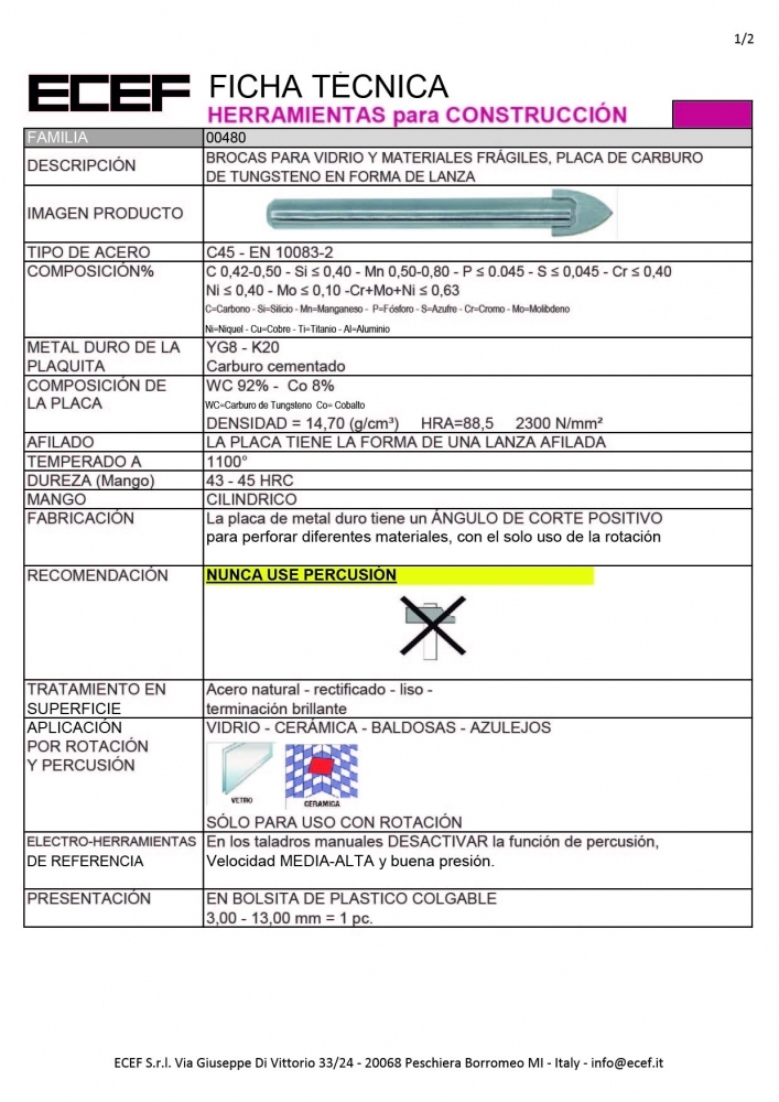 BROCA 8 MM PUNTA FLECHA P/VIDRIO-CERAMICA ECEF